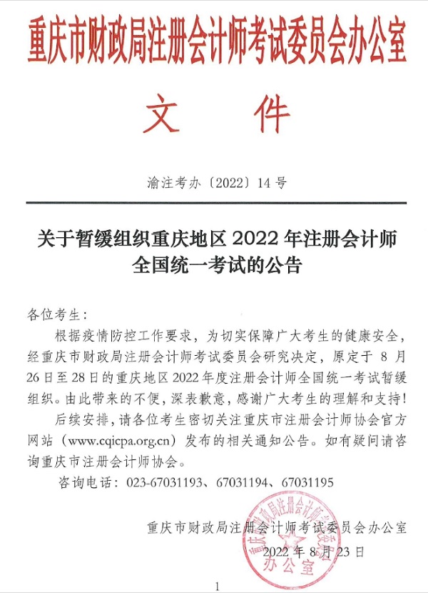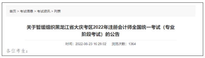 鑒于當前黑龍江省大慶市新冠肺炎疫情的嚴峻形勢,根據相關部門疫情防控工作要求,為切實保障廣大考生的健康安全,經有關方面統籌研判并研究決定,原定于8月26日至28日的大慶考區2022年度注冊會計師全國統一考試(專業階段考試)暫緩組織。