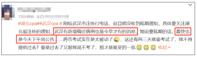 根據考生反饋,“武漢有新增確診案例也是今早才有的消息,要延期的話,最快也是今天下午出公告”。